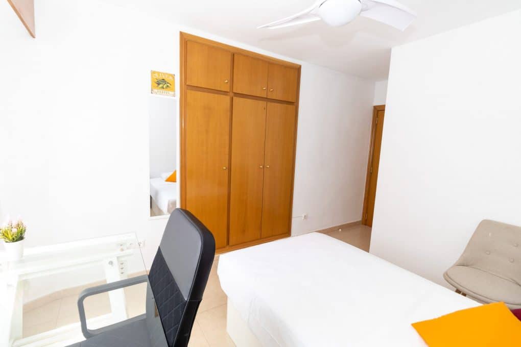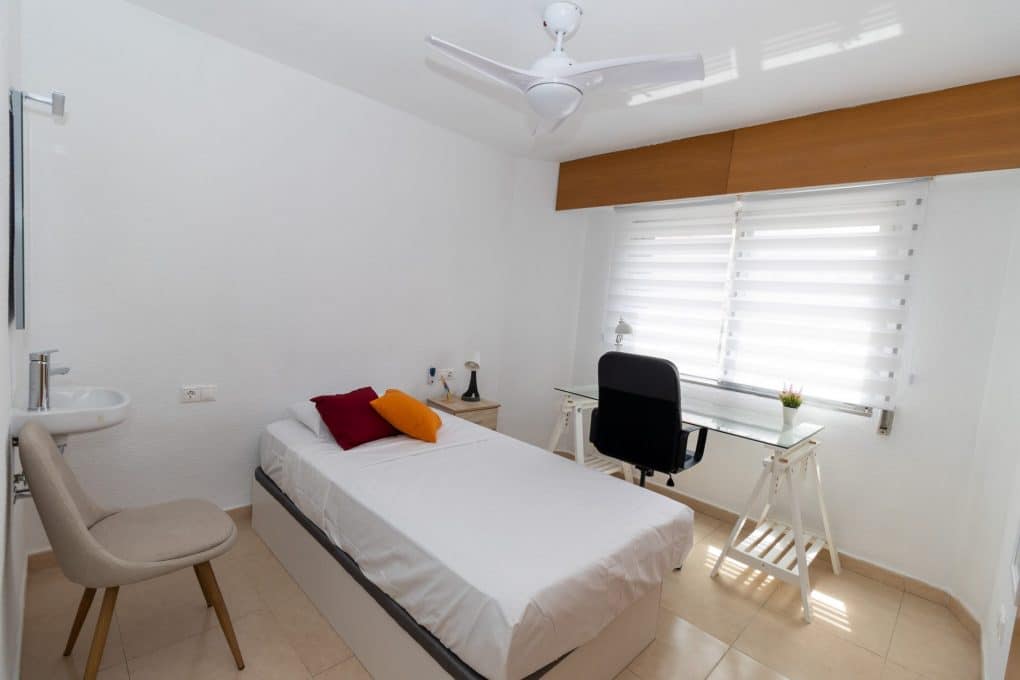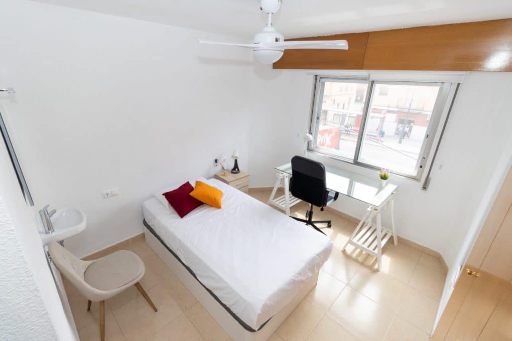 Habitación individual con cama de 105 cms, lavabo, ventilador de techo, escritorio, armario.