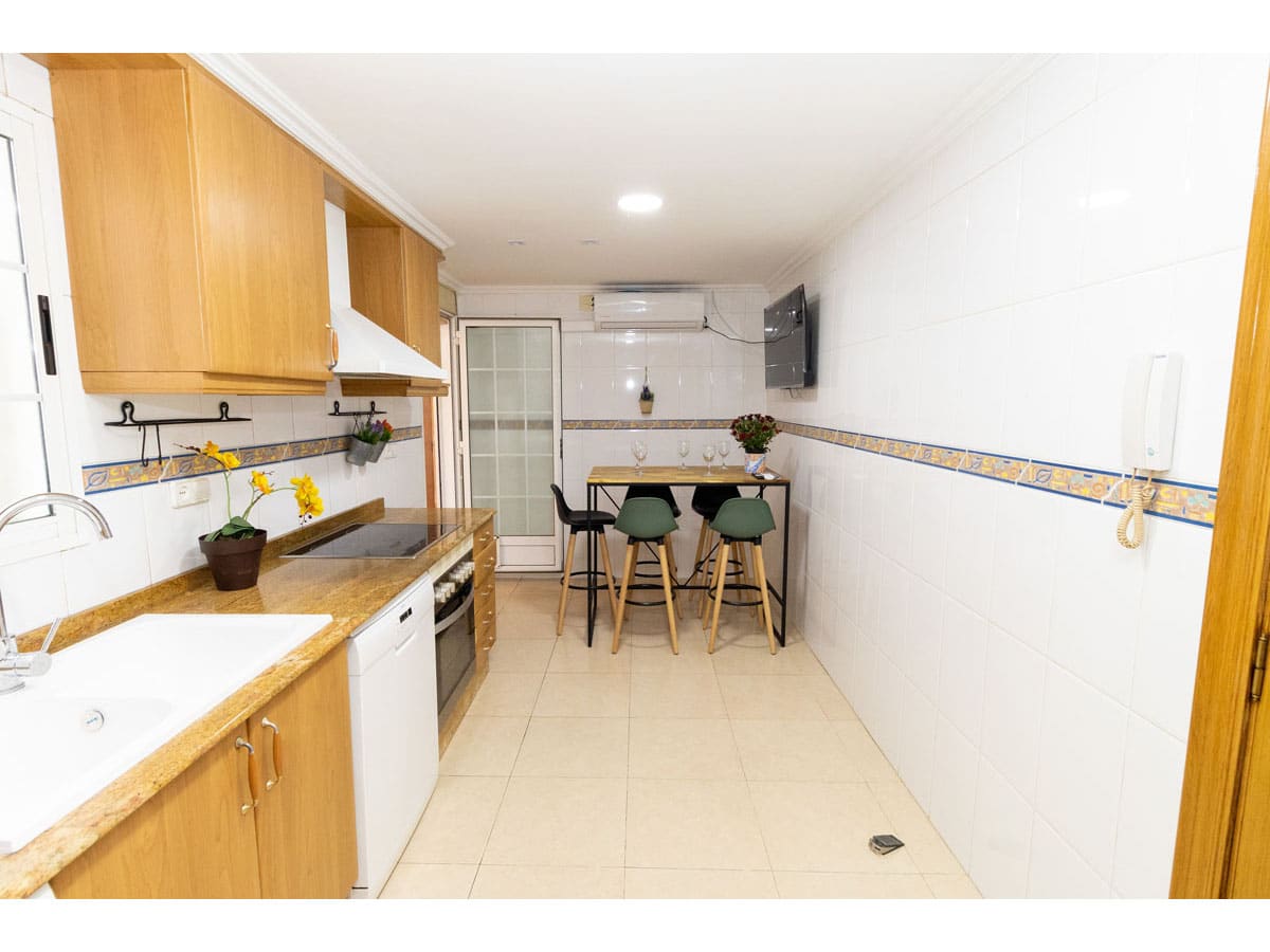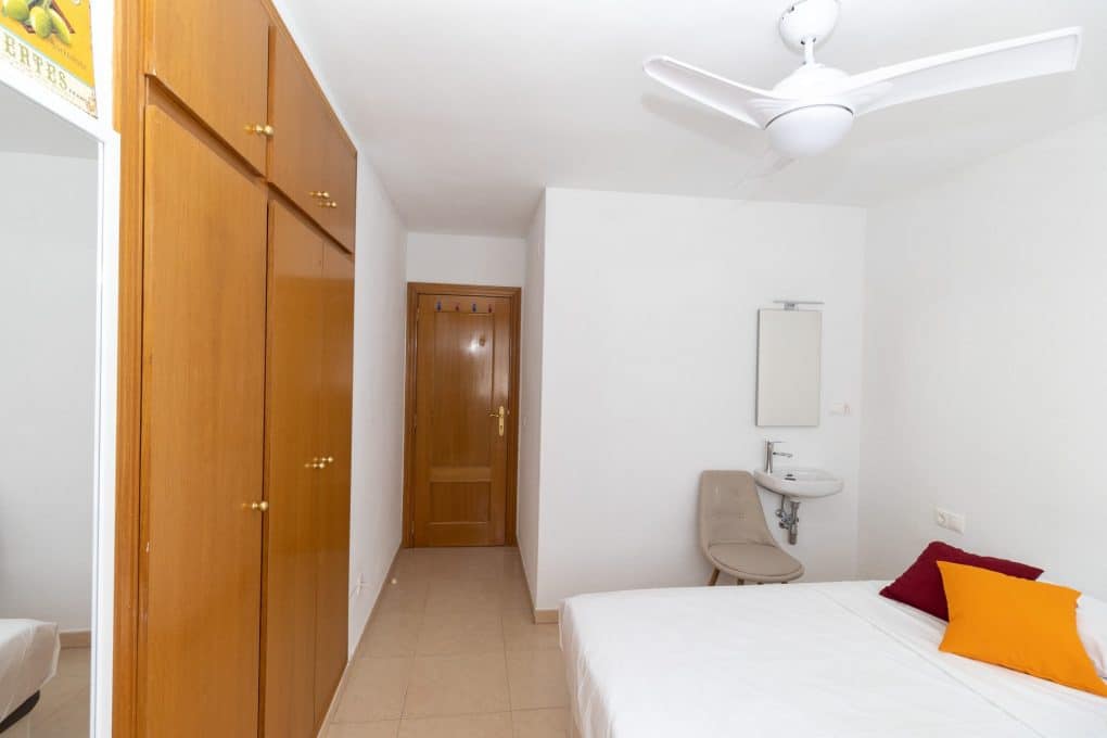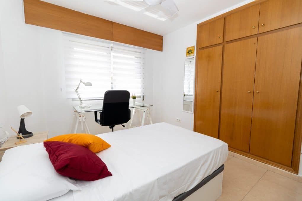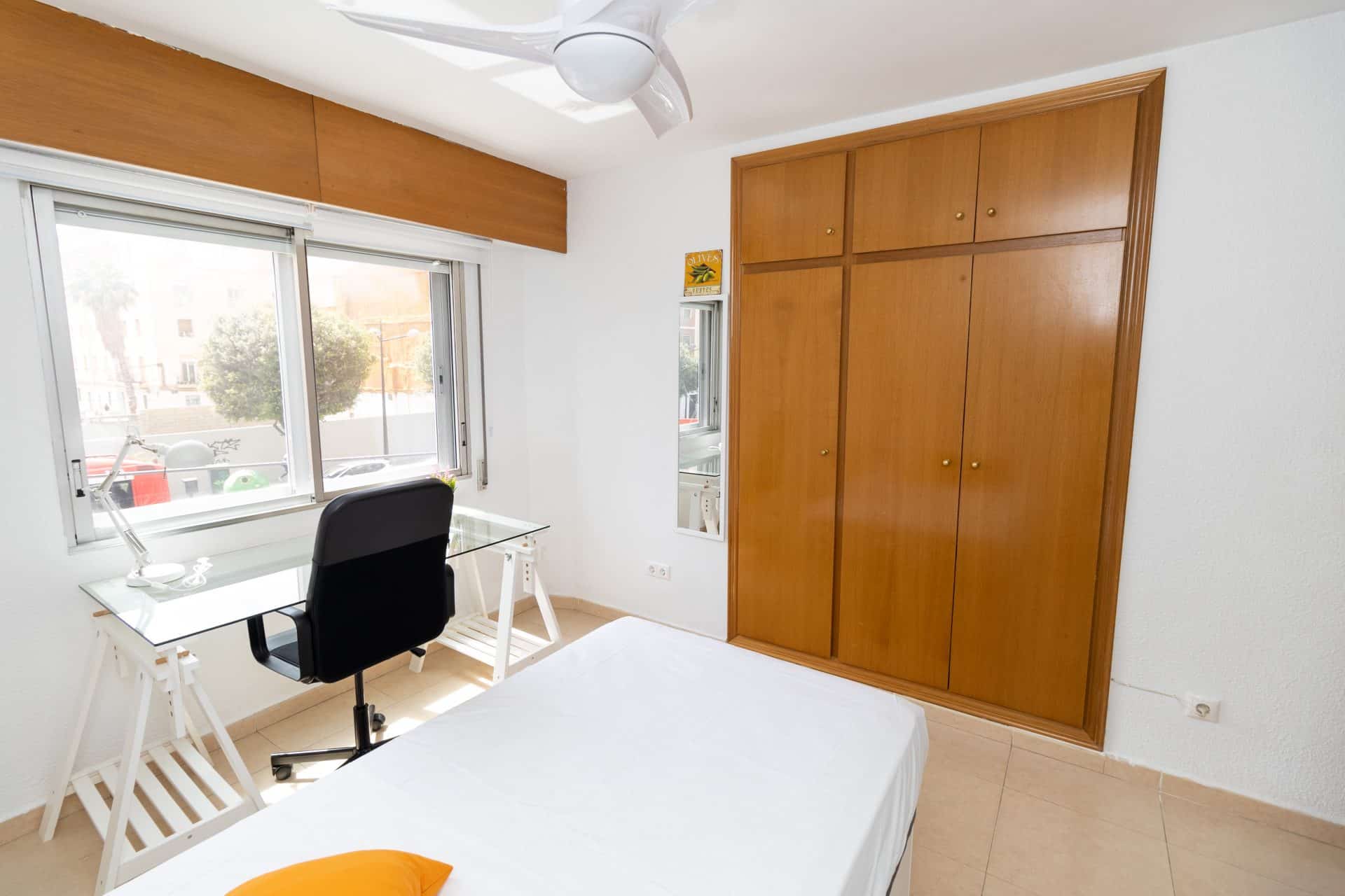 Piso de 5 habitaciones: 3 habitaciones individuales, 1 habitación con balcón, 1 habitación con cama doble, y 2 baños. Las habitaciones 1 y 2 tienen cama de 105 cm, lavabo, ventilador de techo, armario empotrado, escritorio, estantería y vista exterior. La habitación 3 tiene cama de 135 cm, doble armario, ventilador de techo, y escritorio. La habitación 4 tiene cama de 105 cm,armario, escritorio y balcón privado espacioso con vista a la Av del Puerto. La habitación 5 tiene cama canapé de 105 cm, escritorio, armario,y ventilador de Techo. Esta habitación es bastante luminosa, debido a su ventanal que es amplio y con vista exterior. El piso cuenta con 2 baños a compartir entre todos en el piso. Además, el piso tiene una cocina espaciosa, dotada de todos los electrodomesticos necesarios e incluye algunos adicionales como : lavavajillas, cafetera, horno, mixer,sanduchera, tostadora, exprimidor, pesa de alimentos y secador de cabello para todo el piso. En la cocina además de estar muy bien equipada, podréis encontrar un espacio para comer con tus compañeros de piso, ya que cuenta con un comedor con TV y aire acondicionado para disfrutar esos momentos de compartir. El piso también cuenta con patio exterior que conecta con la cocina.